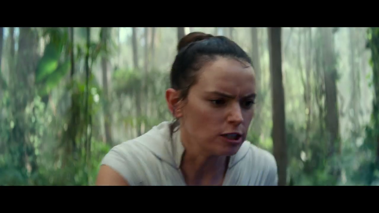 Rey entrenándose con el sable láser en un planeta selvático. ¿La luna santuario de Endor? Es interesante que la joven jedi practica un lanzamiento de sable como el que le vimos hacer a Vader en El retorno del Jedi (aunque nuestra heroína incluso consigue traerlo de vuelta). También podemos ver que junto al árbol hay una sonda de entrenamiento como con la que practicaba Luke en Una nueva esperanza.