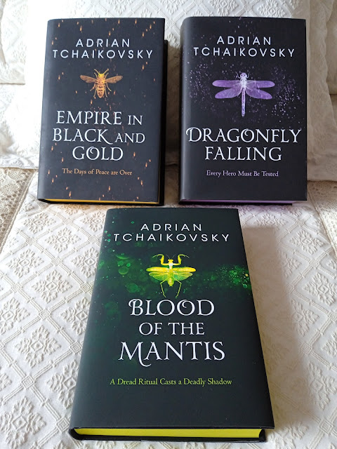 Si queréis animaros con esta aventura en inglés la decalogía de Tchaikvosky está formada por las novelaEmpire in Black and Gold (2008), Dragonfly Falling (2009), Blood of the Mantis (2009), Salute the Dark (2010), The Scarab Path (2010), The Sea Watch (2011), Heirs of the Blade (2011), The Air War (2012), War Master's Gate (2013) y Seal of the Worm (2014).